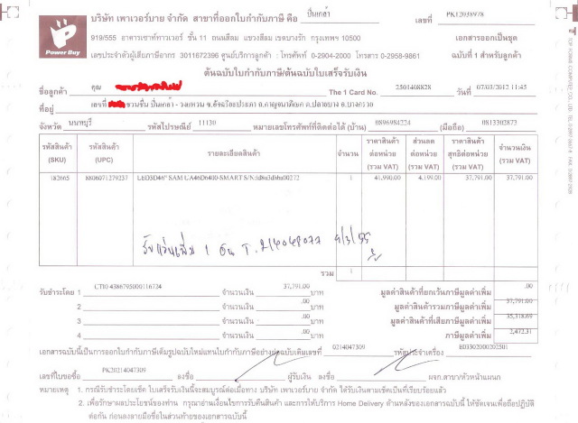 ผมเพิ่งไปซื้อมาเมื่อวันที่ 7 มีนาคม 55 ที่ผ่านมานี้เอง จากเพาเวอร์บาย เซ็นทรัลปิ่นเกล้า ยี่ห้อ Samsung LED 46" SERIES6 รุ่น UA46D6400UR เกิดเปลี่ยนใจอยากได้ 55"ขึ้นมา เลยขอขายครับ สภาพ 99.99% ซื้อมา 37,490 บาท ขอขายที่ 31,500 บาทครับ มีของแถมติดมาคือแว่น 3 มิติ จำนวน 4 อันครับ ประกันเครื่องเหลือเต็มๆครับ รายละเอียดดูได้ที่นี่ครับ ที่พิเศษของรุ่นนี้คือมีช่อง USB 3.0 ไว้ดูหนังจาก Hard disc ได้ลื่นไหลดีมากครับ