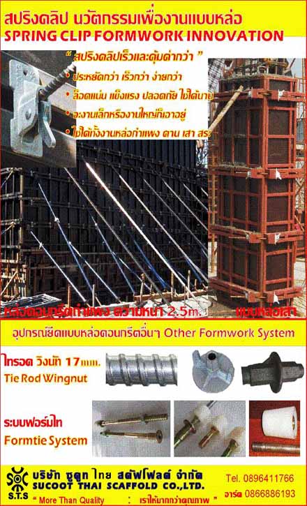 สปริงคลิป นวัตกรรมใหม่เพื่องานแบบหล่อ Spring Clip สปริงคลิป ( New Form tie ) สปริงคลิป นวัตกรรมใหม่เพื่องานแบบหล่อ เป็นอุปกรณ์ยึดแบบหล่อคอนกรีตรูปแบบใหม่ ช่วยให้งานแบบหล่อ ง่ายกว่า เร็วกว่า ปลอดภัยกว่า และ มีต้นทุนถูกกว่าคู่แข่งแน่นอน ด้วยความพิเศษของสปริงคลิป