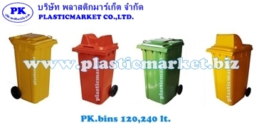 บริษัท พลาสติกมาร์เก็ต จำกัด ผลิตและจำหน่ายถังขยะมาตรฐาน แบบของกทม.- อบต. ขนาด 120 ลิตร 240 ลิตร มีให้เลือกแบบหน้าเรียบ, ฝา 1 ช่อง และ ฝา 2 ช่อง สีของถังคือ สีแดง, เขียว, เหลือง และน้ำเงิน เป็นสีมาตรฐาน
