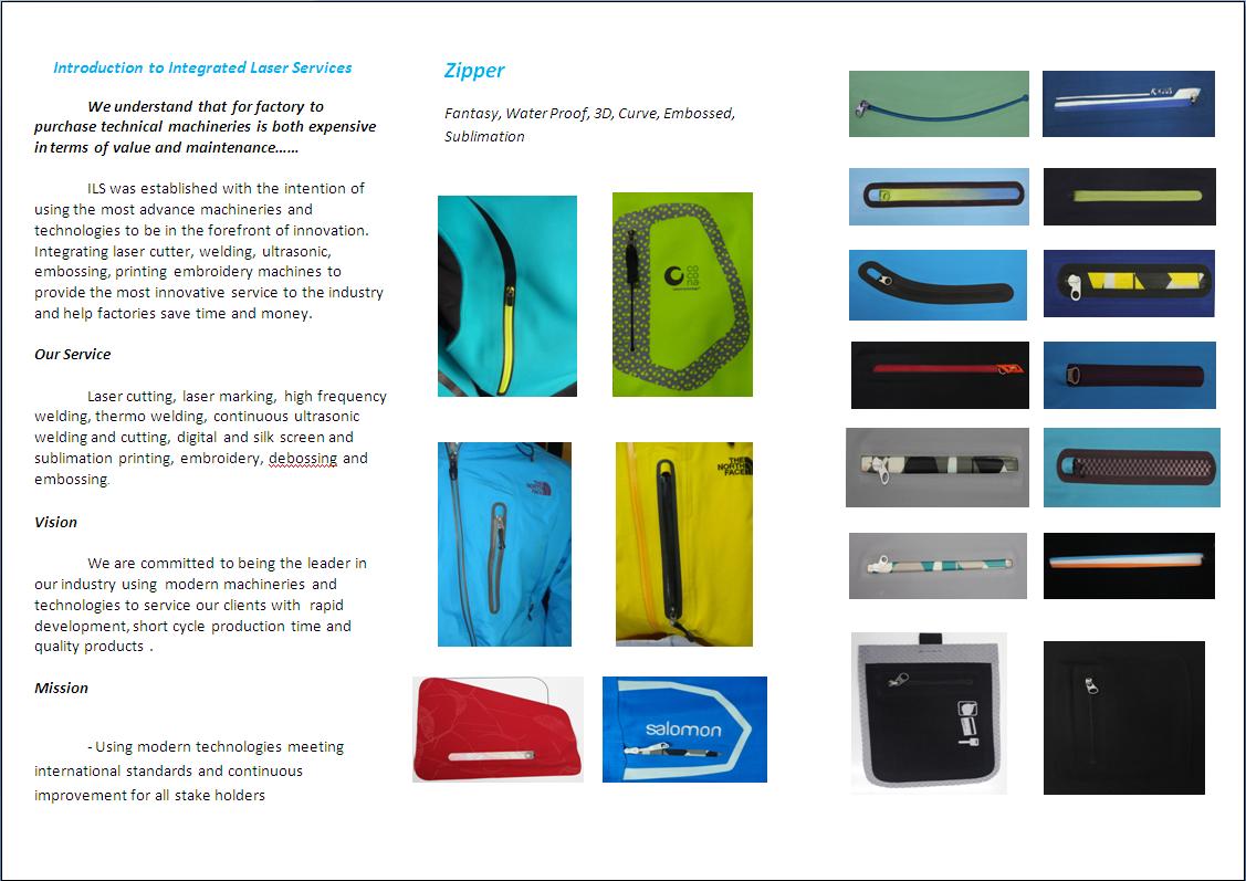 รับงาน Part ทั่วไป เช่น Laser Cutting ผ้า สติกเกอร์ Embossing and Embroidery Screenand Printing Laminate Fusing and Sublimation Printing Zipper Water Proof Thermal, High Frequency and Ultrasonic