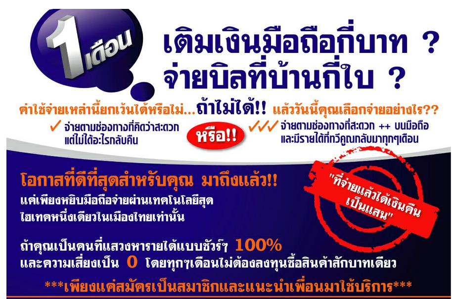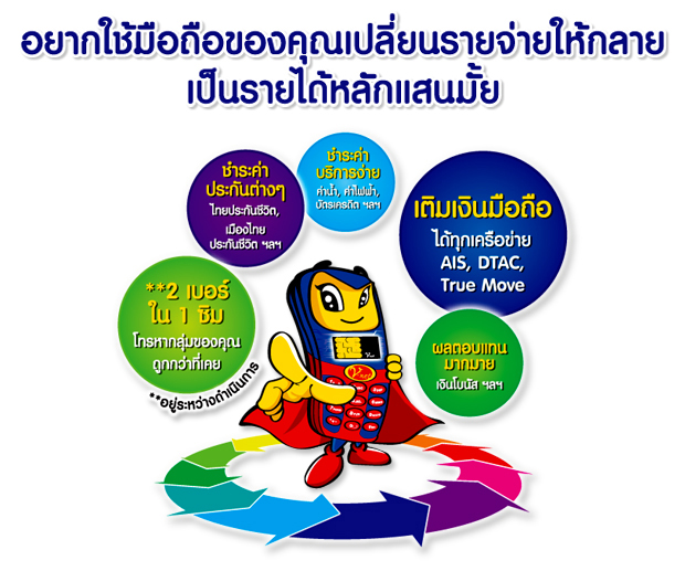 - ด้วยแนวคิดที่เกิดจากการ ช่วยคนไทย ให้ได้รับผลประโยชน์ กลับคืนมาเป็นของตน รักษาค่าเงินบาทของเรา ให้อยู่กับพวกของเราตลอดไป เพราะอะไรนะหรือ ก็เพราะว่า ทุกๆวันนี้ เราทุกคนมีค่าใช้จ่าย กันมากมายทั้งนั้น ไม่ว่าจะเป็น ค่าบ้าน ค่ารถ ค่าน้ำ ค่าไฟ ค่าโทรศัพท์บ้าน โทรศัพท์มือถือ ค่าเน็ต ค่าเกมส์ สารพัด ซึ่งค่าใช้จ่ายตรงนี้ เราต้องมีหน้าที่ คือ "ไปจ่าย" จ่ายเสร็จก็หมดภาระ หมดห่วง หมดกังวล กลับบ้าน สบายใจ แต่เราลืมนึกไปเลยว่า การเดินทางไปจ่ายแต่ละครั้ง เราต้องนั่งรถ เราต้องขับรถ มีค่าใช้จ่ายระหว่างทางเกิดขึ้นอีกไม่น้อย แต่เราก็ไม่ค่อยได้คิดกัน จริงมั๊ยล่ะ...เอาล่ะ ต่อไปนี้ เราได้วิธีคิดมาแล้ว....ต่อจากนี้ไป เราจะจ่ายของเราเอง จ่ายทางโทรศัพท์ มือถือ ของเราเอง ไม่ต้องออกไปร้านเซเว่น หรือ ที่รับจ่ายอีกต่อไปแล้ว แม้แต่ค่าโทรศัพท์มือถือ แบบเติมเงิน เราก็เติมเองได้ ง่ายๆ ไม่ต้องง้อใคร...เอ๊ะ แล้วมันเป็นอย่างไร? ไปดูกันต่อ....