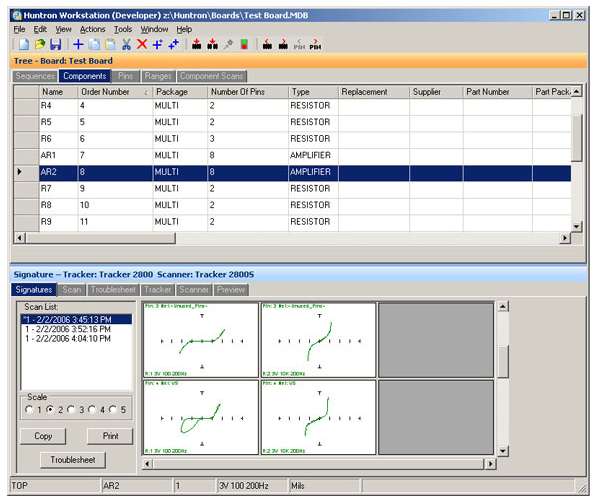 ราคาถูก สนใจติดต่อสอบถามได้ที่ 084 o 7 7 4 500 Huntron 2800 Tracker เครื่องเปรียบเทียบไอซี ดีหรือเสียจาก USA คุณภาพสูงแม่นยำ The NEW 2800 series of Huntron® Tracker® are designed to complement conventional test instruments in the debug and troubleshooting process. Using the proven power-off test method known as Tracker Signature Analysis it eliminates the risk of further circuit damage, which often occurs when power is applied. The Huntron Trackers are suited for today's mixed signal circuit cards where Analog and Digital are mixed together. The Tracker 2800's feature variable range parameters resulting in over 100 combinations of voltage, source resistance and frequency. The 2800 series is a great off-line support tool for the automated Huntron Access Prober diagnostic systems. Features: Fast Signature Refresh Enhanced Range Selections Full Screen Signature Zoom Color Touch Screen controls Huntron SigAssist® built-in Built-in DC Voltage Source for testing gated devices (i.e. SCR's, relays, etc.) Up to 40 pin scanning with the Tracker 2800S Test Frequencies: 20 Hz, 50 Hz, 60 Hz, 200 Hz, 500 Hz and 2 kHz Open Circuit Voltage (peak voltage): 200 mV, 3 V, 5 V, 10 V, 15 V, 20 V Source Resistance: 10 Ω, 50 Ω, 100 Ω, 500 Ω, 1 kΩ, 5 kΩ, 10 kΩ, 50 kΩ and 100 kΩ Range Selection: Manual or Auto Scan Channels: 2 (A, B, Alternate), 40 pins/channel (2800S) Display: Color TFT LCD with Touch screen; LED backlight Warranty: 1 Year Power Source: 100/115 or 230 Vac, 50/60 Hz Accessories Supplied: MP20 Microprobes (one pair), common test leads, one blue clip lead, power cord and instruction CDROM. Dimensions (H x W X D): 4.4" x 11.1" x 8.5" (112 x 282 x 221 mm) Weight:6 lbs (2.8 kg)