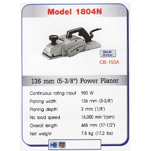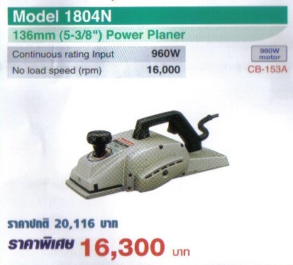 กบไฟฟ้า เครื่องไสไม้ MAKITA รุ่น 1804N Power Planer - กำลังไฟที่ใช้ 960W - หน้ากว้างการไสไม้ 136mm(5-3/8") - กบกินเนื้อไม้ลึก 3mm(1/8") - ความเร็วขณะหมุนเปล่า 16,000rpm - ความยาวรวม 455mm - น้ำหนักสุทธิ 7.8kg - อุปกรณ์ ระบบกำจัดฝุ่น,ชุดกล่องไม้ถือ - มีใบรับประกันสินค้าให้ 6 เดือน จากบริษัท MAKITA **ขายส่ง-ปลีก อุปกรณ์ก่อสร้าง เครื่องมือไฟฟ้าทุกชนิด บริการส่งทั่วประเทศ**