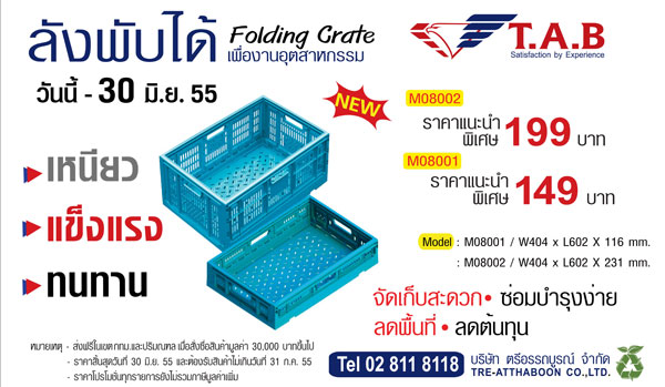 T.A.B เปิดตัวสินค้าใหม่กับ ลังพับได้ เหนียว แข็งแรง ทนทาน จัดเก็บสะดวก ซ่อมบำรุงง่าย ลดพื้นที่ ลดต้นทุน รุ่นM08002 เพียง 199 บาท และรุ่นM08001 เพียง 149 บาท สอบถามข้อมูลเพิ่มเติม บริษัท ตรีอรรถบูรณ์ จำกัด ฝ่ายขายโทร. 02 811 8118 (จ.-ศ.) โทรสาร 02 811 8115 Facebook : www.facebook.com/TABCorporation E-mail :