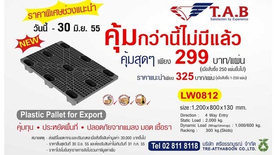 คุ้มกว่านี้ไม่มีอีกแล้วกับ Pallet LW0812 เพียง 299 บาท/แผ่น (เมื่อสั่งซื้อ 250 แผ่นขึ้นไป) ราคาแนะนำ 325 บาท/แผ่น (เมื่อสั่งซื้อ 1 - 250 แผ่น) วันนี้ - 30 มิ.ย. 55 เท่านั้น!!! สอบถามข้อมูลเพิ่มเติม บริษัท ตรีอรรถบูรณ์ จำกัด ฝ่ายขายโทร. 02 811 8118 / 081 736 7527 (จ.-ศ.) โทรสาร 02 811 8115 Facebook : www.facebook.com/TABCorporation E-mail : [email protected] www.tre-atthaboon.com