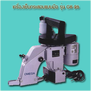 เครื่องเย็บกระสอบแบบมือ รุ่น GK-26 Model GK-26 Spec. of motor ( V/Hz) 220 VAC/50 Hz Spec. of sewing thread 20-count6-9ply pdyvinyaaloonolfibre yarn Spec. of sewing neddle No.25 Max. length of thread mark(mm) >6.5 Max. sewing speed (stitches/min) 1250 Dimension (L×W×H) (mm) 268×160×330 Net weight (kg) 5.5