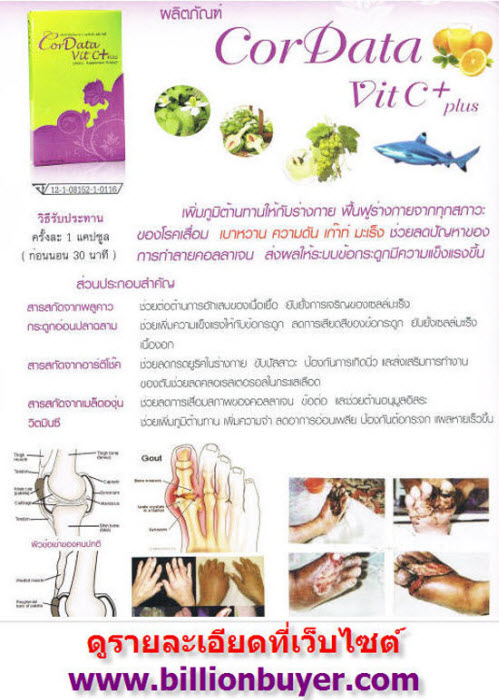 Cor Data Vit C+Plus( คอร์ดาต้า วิทซี พลัส)ช่วยเพิ่มภูมิต้านทานให้กับร่างกาย, ฟื้นฟูร่างกายจากทุกสภาวะของโรคเสื่อม เช่น เบาหวาน, ความดัน, เก๊าท์, มะเร็ง, ช่วยลดปัญหาของการทำลายคอลลาเจน ของเนื้อเยื่อเกี่ยวพันทั่่วร่างกาย ส่งผลให้ระบบข้อกระดูกมีความแข็ง