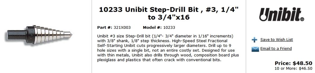 ต้องการขายดอกเจาะStep Drill ยี่ห้อ UNIBIT # 3 (MADE IN USA by IRWIN) เจาะได้9ขนาดตั้งแต่1/4นิ้ว-3/4นิ้ว ก้านจับ3หุน ของ ใหม่แท้100% ราคา950.- ติดต่อ022512637 พรเทพ