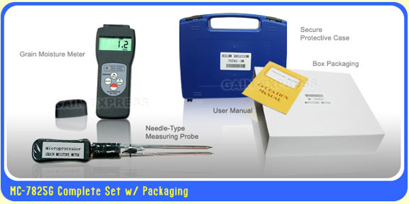 เครื่องวัดความชื้น รุ่น MC-7825G ใช้ขาวัดขนาดยาว 2 ขาเป็นตัวอ่านค่าความชื้น คำนวณโดย micro-computer LSI circuit และ crystal time base อ่านค่าได้รวดเร็ว และแม่นยำ เหมาะกับการใช้ตรวจวัด และวิเคราะห์ความชื้นในเมล็ดในกระบวนการจัดซื้อ จัดเก็บ การบรรจุ หน้าจอแสดงผลระบบดิจิตอล ทำให้อ่านค่าได้อย่างแน่นอน ขณะที่ไฟ LED จะมีรหัสสีต่าง ๆ เพื่อแสดงสภาพความชื้นของเมล็ดที่เราวัดด้วย