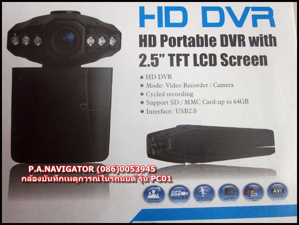 วันนี้ P.A.NAVIGATOR ขอเสนอสินค้าตัวกล้องบันทึกเหตุการณ์ในขณะขับขี่ รุ่นแรกของร้าน รุ่น PC01 ตัวกล้องรุ่นนี้มาพร้อมหน้าจอ TFT LCD Screen 2.5 นิ้ว สามารถบันทึกได้ทั้งภาพถ่ายและบันทึกวีดีโอพร้อมเสียง สามารถเปลี่ยนแบตเองได้เลย โดยใช้แบตของ NOKIA BL4C โดยรองรับหนวยความจำได้ถึง 64GB