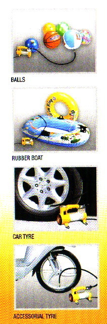เครื่องปั๊มลมไฟฟ้า เครื่องสูบลมยางไฟฟ้า สามารถใช้เติมยางรถทั่วไป ได้แก่ รถเก๋ง รถปิคอัพ จักยานยนต์ จักรยาน ลูกบอล ของเล่น หรืออุปกรณ์ที่ใช้ลมต่าง ๆ