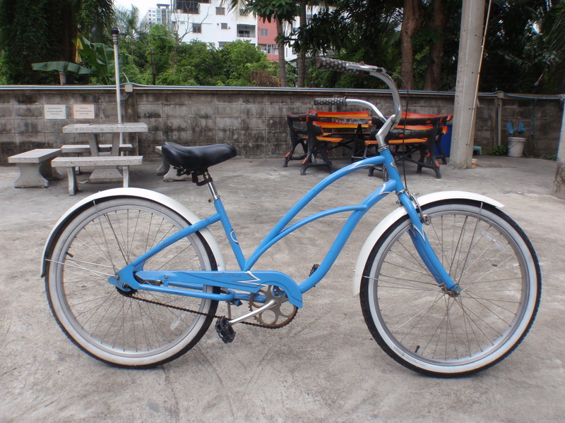 จักรยาน ครุยเซ่อร์ ฟิกเกียร์ แช่ขาได้ ยี่ห้อ Electra ของ USA ตัวถังเหล็กสีฟ้า บังโคลนสีขาว ยางนอกขอบขาว 26 นี้ว รถสวย สภาพดี ปั่นสนุก น่าสะสม