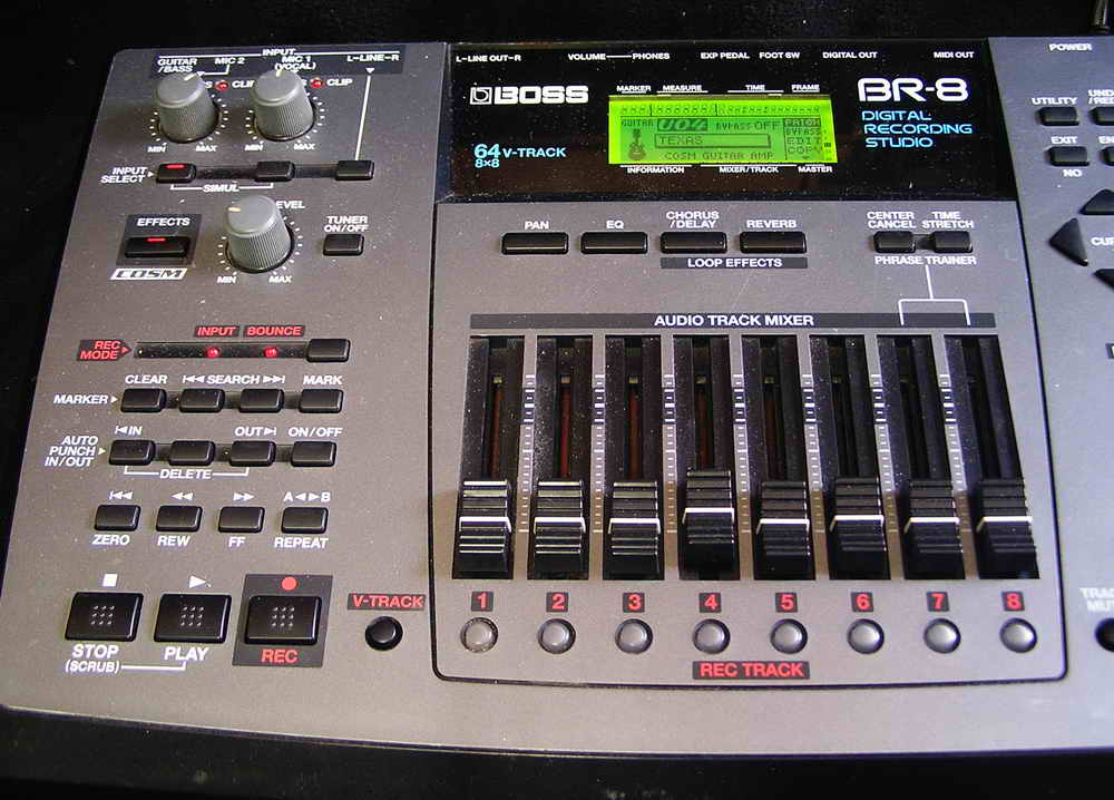เอาไว้ซ้อมGuitarได้นะครับ มีRhythm Guide, Phrase Trainer, and a built-in chromatic tuner และจำลองเสียง Effect ไว้เยอะ มีหม้อแปลงให้ BR-8: Digital Recording Studio Features The BOSS BR-8 is a 24 bit 8-track digital recording workstation for guitar players and other musicians seeking a simple, high-powered alternative to tape-based personal studios. Its acclaimed V-Studio technology—including Virtual Tracks, COSM™ effects processing and true non-destructive operation—is enhanced with unique features for guitarists including a Rhythm Guide, Phrase Trainer, and a built-in chromatic tuner. 8-track digital recording studio with 64 Virtual Tracks Zip100 drive for recording to convenient, inexpensive 100MB Zip disks Simplified user interface with graphic LCD making digital recording very easy 3 stereo effects processors including COSM Guitar and Bass Amp models, acoustic/bass guitar modeling and dynamics and vocal processing Innovative Rhythm Guide with over 80 built-in rhythm patterns Built-in chromatic tuner and dedicated Hi-Z guitar input Phrase Trainer for slowing down recordings to half-speed for learning guitar licks 24-bit analog inputs, including 2 microphone inputs Optical digital output for connecting to digital devices such as DAT or MD Note that this product is no longer in production. Similar capabilities can be found in the BR-1180/1180CD Digital Recording Studio.