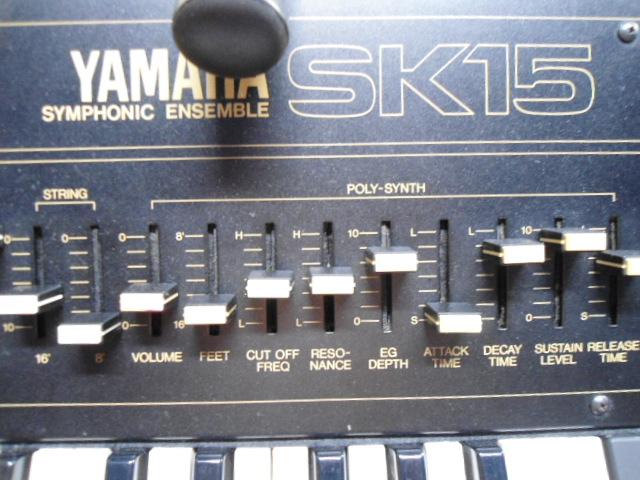 ยามาฮ่า sk15 ตัวผลิตสุดท้ายของ SK ใช้งานได้สมบูรณ์ 100% ไฟ 100v มีหม้อแปลงให้ ซินโพลีโฟนิค กดค้างได้ 7 คีย ซึ่งหาไม่ได้ง่ายๆกับซินวินเทจ ที่ส่วนใหญ่ทำออกมาเป็นโมโน ซิน ประกอบด้วยแผงควบคุม cut off, Res, EG, Feet 8-16, A D S R นอกจากเสียงซินธิไซเซอร์ ยังมี ออแกน และ สตริง เอฟเฟค tremolo, ensemble และ vibrato มีติดเครื่อง 3 เสียงที่ว่า ผสมกันได้ครับ ออแกน สตริง ซิน