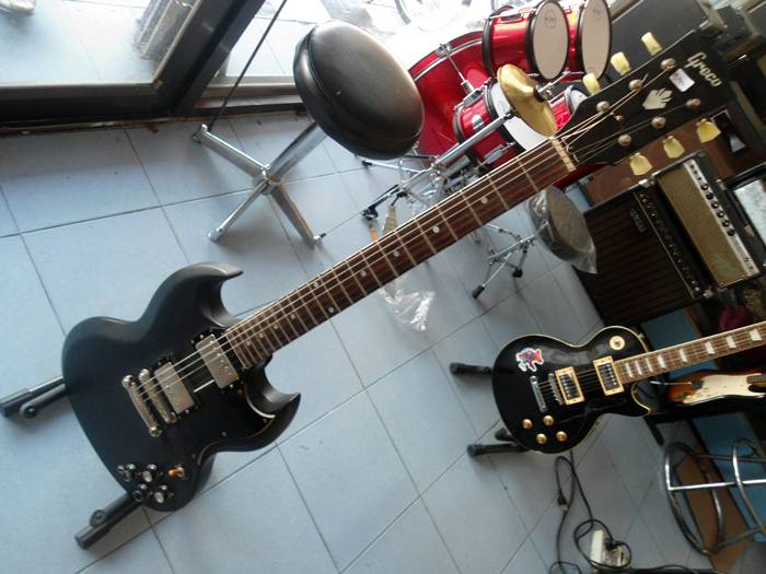 SG GRECO SETNECK ทำสีดำด้าน คอเคยร้าว ซ่อมมาดีแล้ว รับประกันตลอดอายุ PU เดิมๆ สายเงินเสียงดีมากน้องๆกิ๊บสันเลย 9,500 tel.089 5337530 แถมกระเป๋า