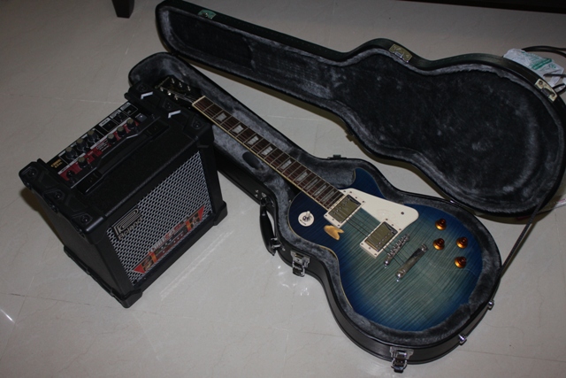 ขายกีต้าร์Epiphone lespual STD plus สีฟ้า ยกชุดพร้อมกล่องกับ Amp Roland Cube 15XL