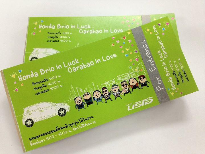 ขายบัตรคอนเสิร์ต Honda Brio in Luck : Carabao in Love ซึ่งคอนเสิร์ตจะมีขึ้นในวันอาทิตย์ที่ 12 กุมภาพันธ์ 2555 รอบเวลา 15.00 – 18.00 น. ณ รอยัล พารากอน ฮอลล์ ชั้น 5 สยามพารากอน การแสดงคอนเสิร์ตของวงคาราบาวเต็มรูปแบบ เนื่องจากไปจองรถยนต์ HONDA แล้วได้รางวัลมา 3 ใบ ไม่มีเวลาไปดู ใครเป็นสาวกคาราบาว ต้องการไปดูติดต่อ คุณคนึง 086-535-6104 ในงานมีของรางวัลแจกด้วย