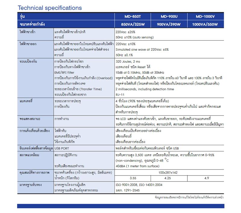- แรงดันไฟฟ้าขาออก 220 Vac+/-10% (โหมดปรับแรงดันไฟฟ้า) และ 220Vac+/-5% (โหมดจ่ายไฟสำรอง)