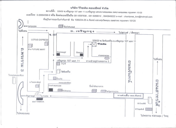 ขอให้ท่านผู้ที่สนใจจะขาย ช่วยส่งข้อมูลรายละเอียดสินค้าให้มากที่่สุด และ ชื่อผู้ขาย โทรศัพท์ ที่่ตั้งสินค้า (ถ้ามี)รูปถ่าย EMAIL เดินทางได้โดยรถไฟฟ้า BTS ลงสถานี ตากสิน แล้วต่อรถเมล์สาย 1,205,15,75,22...ที่มุ่งหน้ามายัง 4 แยกถนนตกโดยลงป้ายรถเมล์ที่ถึงก่อน 4 แยกแล้วเดินไปหน้าปากซอย 107เข้าไปประมาณ 20 เมตร เจอวินมอเตอร์ไซด์ไปประดู่ 11 บริษัท รีไซเคิลคอนเซ็พท์ จำกัด เลขที่ 329/20-21 ค่ามอเตอร์ไซด์ 20 บาท หรือ... มาทางเรือก็สะดวกครับโดยลงท่าน้ำวัดราชสิงห์ขร แล้วเดินออกมาถนนเจริญกรุงข้ามถนนขึ้นรถเมล์ สายอะไรก็ได้มุ่งหน้าสู่ถนนตกมา 4 ป้ายรถเมล์ และ ลงเดินไปปาก ซอยเจริญกรุง 107 เหมือนรายละเอียดข้างบน BTS ส่งที่สถานี ตากสิน เท่านั้น ติดต่อช่วงเวลา 8.00-20.00 วันจ-ศ ถ้าเป็นวันเสาร์อาทิตย์ต้องนัดล่วงหน้าครับ ** บริษัท รีไซเคิล คอนเซ็พท์ จำกัด 329/20 ซ.เจริญกรุง 107 แยกประดู่ 11 ถ.เจริญกรุง แขวงบางคอแหลม เขตบางคอแหลม กทม. 10120 Email: