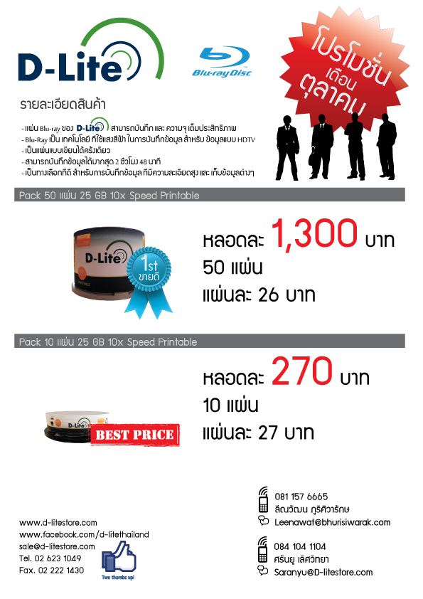 รายละเอียดสินค้า แผ่น Blu-ray ของ D Lite สามารถบันทึก และ ความจุ เต็มประสิทธิภาพ Blu-Ray เป็น เทคโนโลยี ที่ใช้แสงสีฟ้า ในการบันทึกข้อมูล สำหรับ ข้อมูลแบบ HDTV เป็นแผ่นแบบเขียนได้ครั้งเดียว สามารถบันทึกข้อมูลได้มากสุด 2 ชั่วโมง 48 นาที ?เป็นทางเลือกที่ดี สำหรับการบันทึกข้อมูล ที่มีความละเอียดสูง และ เก็บข้อมูลต่างๆ แผ่นของ D lite ได้รับการทดสอบแล้วว่าสามารถใช้งานร่วมกับ Printer Inkjet ได้ ด้วยประสิทธิภาพของสารเคลือบผิวหน้าพิเศษ ป้องกันรอยขีดข่วน รอยนิ้วมือ ฝุ่นละออง ทำให้มั่นใจได้ว่า หนัง, เพลง หรือ ข้อมูลอื่นๆ จะไม่สูญหาย