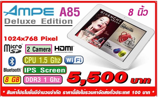 รุ่นยอดนิยม A810 Allwinner 8” เกรด A 1.5Ghz Ram 1 GB /Rom 8GB Tablet เกรดA มีBrandname “AMPE A-85 DELUXE” หรือ “SANEI N-83 DELUXE” รุ่นนี้ Body เหมือน iPAD2 มีกล้องหน้า 1.3 MP กล้องหลัง 2MP ,มีBluetooth , จอIPS Screen เหมือน iPAD ,1024x768 Pixel ภาพคมชัดสุดยอด ขายส่ง 3ตัวขึ้นไป ราคาตัวละ 4,800 บาท ขายปลีก 5,500 บาท สนใจโทร 0814472288 คุณเอก เชิญชมสินค้าตัวอื่นๆครับ WWW.ANDROIDS-TABLET.COM มีความยินดีขอเสนอTablet รุ่นที่ราคาถูกและดีที่สุดในขณะนี้ กับCPUที่มาแรงที่สุดในขณะนี้ A10 Allwinner เราคัดเฉพาะเกรด A เท่านั้น(เชิญอ่านบทความ Tablet A10 เกรดA และเกรด B แตกต่างกันอย่างไรไดที่ www.facebook.com/androids.tablet