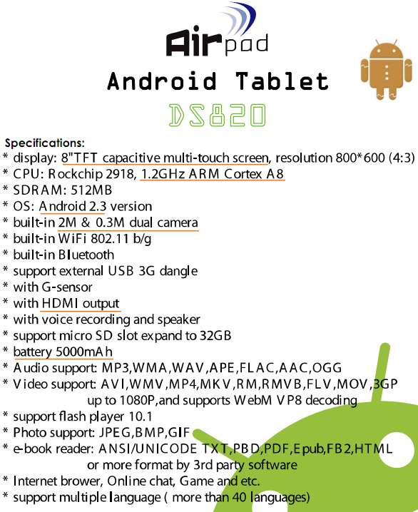 AirPad DS820A (Android Tablet 8 Inch,CPU 1.2GHz, Ram 1GB, 3G Aricard Ready)
