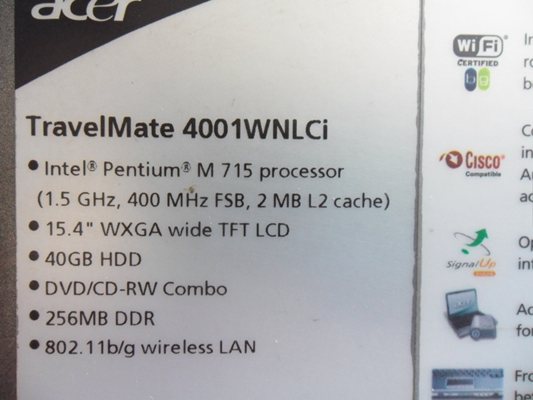 สวยๆ ค่า Acer TM 4000 มือสอง ตัวนี้ HARDDISK 40 gb นะคะ สภาพเดิมๆ เลยค่ะ ใหม่มากๆ ค่า Acer TM 4000 มือสอง ตัวนี้ HARDDISK 40 gb นะคะ สภาพเดิมๆ เลยค่ะ ราคา 4,500 สภาพสวยเว่อร์ แบตเก็บไฟ ราคาโดนใจ รายละเอียดคุณลักษณะ (Specification) TravelMate 4000 Series Specifications Part Number: TravelMate4000 TravelMate 4000 Feature Description Part Number Varies by model Processor / Speed Intel Centrino Pentium M 1.5GHz or higher