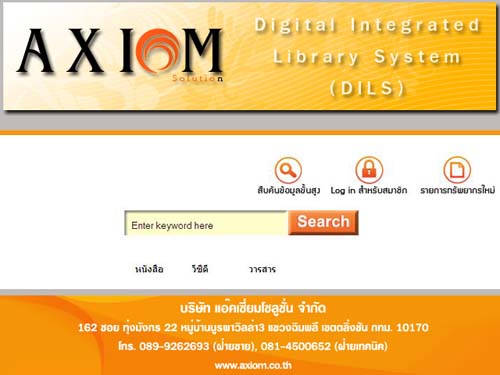 บริษัท Axiom Solution จำกัด ได้พัฒนาระบบห้องสมุดอัตโนมัติจากโปรแกรม Opensource หลายๆโปรแกรมมาประยุกต์ใช้งานร่วมกันภายใต้ชื่อระบบใหม่ว่า "DILS" มาตรฐานการจัดเก็บ Marc 21 ระดับสากล ประสิทธิภาพการทำงานเทียบเท่ากับระบบห้องสมุดใหญ่ๆหลายๆที่ที่ใช้กันแต่ระบบของเรามีราคาที่ถูกกว่าและไม่เสียค่า License รายปี ดูแลบริหารจัดการง่าย ด้วยทีมงานพัฒนาที่มีประสบการณ์สำหรับการพัฒนาระบบดังกล่าวให้กับทางระดับมหาวิทาลัยชั้นนำมาแล้วหลายแห่ง