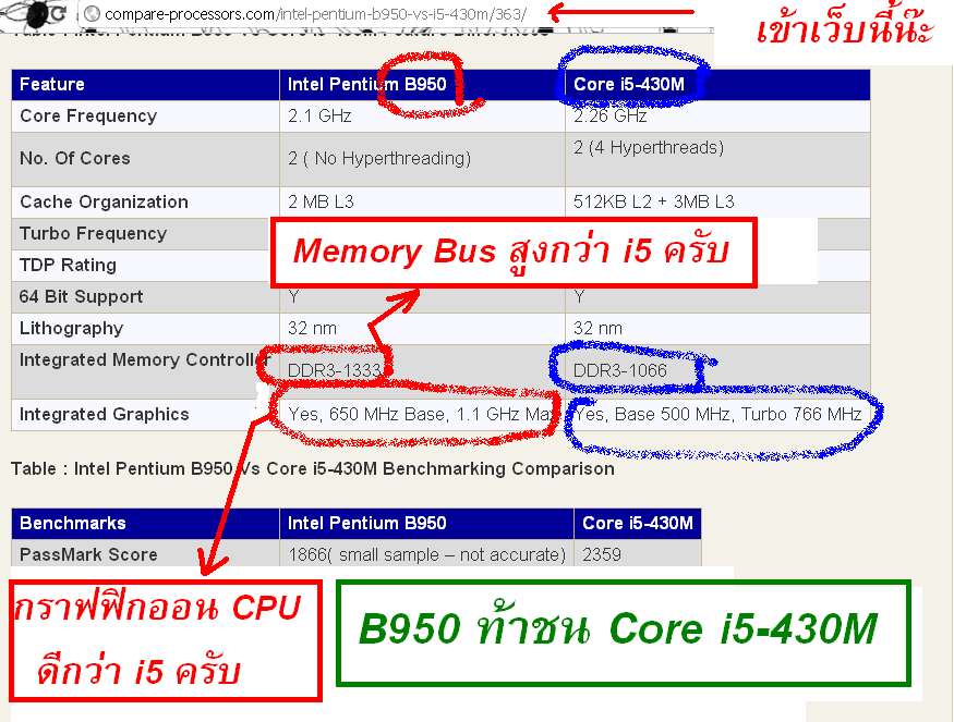 รูปด้านบนเป็นการเปรียบเทียบ Core B950 กับ Core i5 ซึ่งเมื่อคุณคลิกที่รูปแล้ว ก็จะทราบว่ามีข้อดีข้อเสียอย่างไรครับ