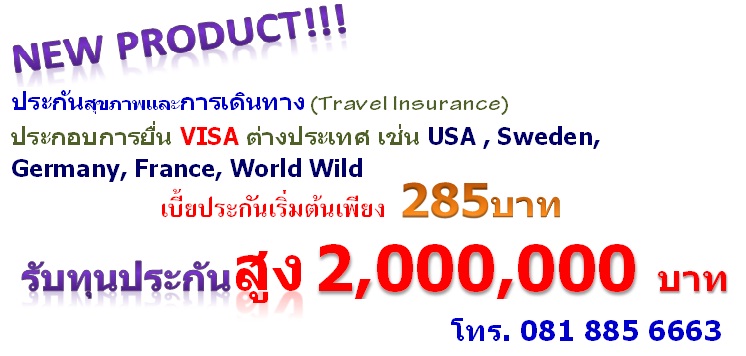 ประกันสุขภาพเดินทางและอุบัติเหตุ (Travel Insurance) สำหรับขอVISAเดินทางไปต่างประเทศ เช่น เยอรมัน,ฝรั่งเศษ,สวีเดน,world wild เบี้ยประกันเริ่มต้นเพียง 285 บาท รับทุนประกัน 2 ล้านบาท ปริ้นเอกสารออนไลน์ไปยื่นวีซ่าได้เลย