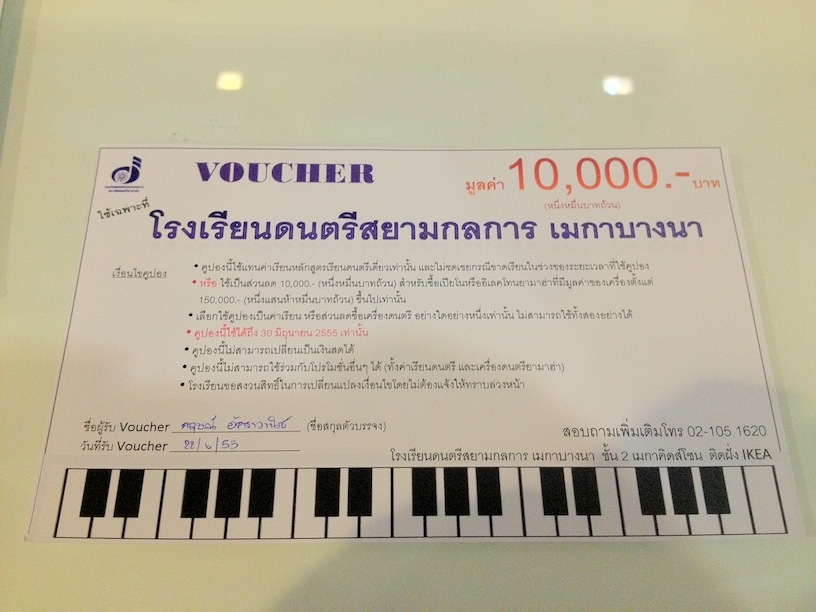 Gift Voucher โรงเรียนดนตรีสยามกลการสาขาเมกาบางนา มูลค่า 10,000 บาทซึ่งสามารถใช้แทนค่าเรียนหลักสูตรดนตรีเดี่ยว หรือใช้เป็นส่วนลดกรณีซื้อเปียโนหรืออิเลคโทนมูลค่า 150,000 บาทขึ้นไป ********ราคามูลค่า 10,000 บาทขายเพียงครึ่งราคา 5,000 บาทเท่านั้นครับ********* ปล.คูปองนี้สามารถใช้ได้ถึง 30 มิถุนายน 2555 ครับ