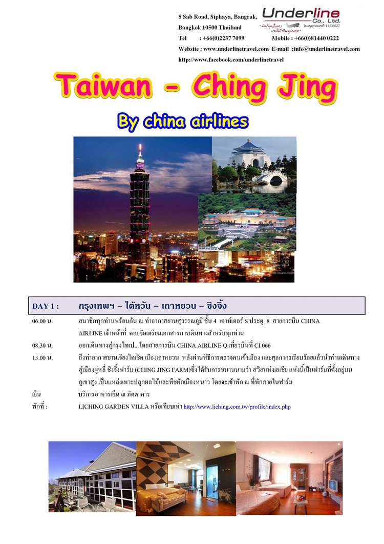 นำท่านสู่ฟาร์จิ้งโจ้ ด้วยบรรยากาศแบบสวิตเซอร์แลนด์ ในเกาะไต้หวัน พร้อมล่องเรือชมสุริยันจันทรา ที่ได้รับการขนานนามว่า "งดงามราวกับภาพวาด" และพาคูรชม "อนุสรณ์สถานเจียงไคเช็ค" ที่มีความสูงถึง 508 เมตร ให้คุณได้สนุกสนามต่อด้วยการช้อปปิ้งสุดมันส์ในย่าน "ซีเหมินติง" แหล่องรวมสินค้านานาชนิดมีให้เลือกมากมาย และนำคุณผ่อนคลายกับบรรยากาศสุดหรูด้วยโรงแรม ระดับ 4 ดาว