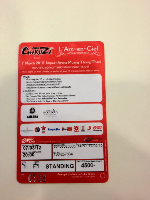 ขายบัตรคอนเสิร์ต L’Arc~en~Ciel WORLD TOUR 2012 in Bangkok ของเเท้เเน่นอน รอบแสดงวันที่ 7 มีนาคม 2555 ด่วนครับ!!!!!!! เป็นบัตร Standing โซน F1 ราคาเต็มใบละ 4,500 รายละเอียดราคาบัตร >> http://www.thaiticketmajor.com/concert/concert-detail.php?sid=1107