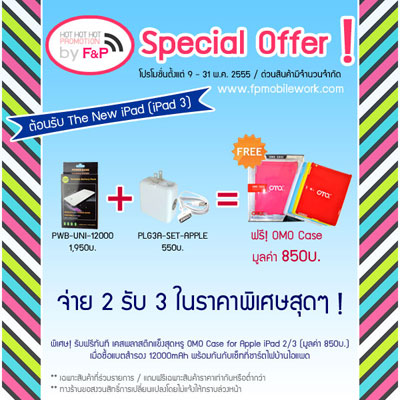 อ่านรายละเอียดโปรโมชั่นจ่าย2รับ3สำหรับสาวกไอแพดได้ที่ --- http://www.fpmobilework.com อ่านรายละเอียดโปรโมชั่นจ่าย2รับ3สำหรับสาวกไอแพดได้ที่ --- http://www.fpmobilework.com อ่านรายละเอียดโปรโมชั่นจ่าย2รับ3สำหรับสาวกไอแพดได้ที่ --- http://www.fpmobilework.com Promotion สุดคุ้ม ประจำเดือนพฤษภาคม 2555 เอาใจสาวกไอแพดค่ะ รับฟรีทันที เคสไอแพด2/3 สีสันสดใส มูลค่า 850 บาท เมื่อซื้อที่ชาร์ตแบตพกพาความจุ 12000 MAH (Power Bank / THB1950) พร้อมกันกับเซ็ทที่ชาร์ตในบ้านสำหรับไอแพด (iPad 3.1A Wall Charger SET / THB550) หรือ ที่วางไอแพดในรถยนต์ (Universal Car Holder for iPad & Other Tablets / THB450) อย่างใดอย่างหนึ่ง รีบๆหน่อยนะคะ โปรโมชั่นหมดเขต 31 พฤษภาคมนี้แล้วค่ะ
