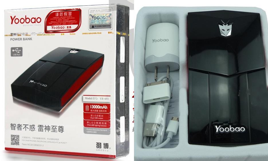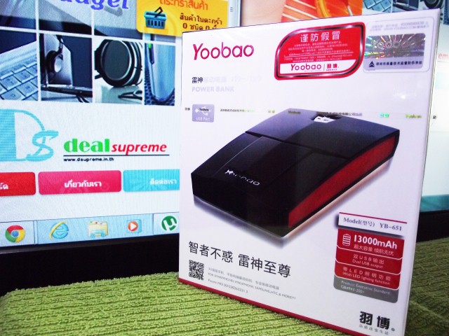*** รับประกันสินค้า 6 เดือน *** Specifications: oProduct name: YOOBAO Thunder power bank, Model: YB651 o Suitable for mobile phones, iPhone, iPad, cameras, HTC, SAMSUNG, Blackberry, Nokia, PSP/NDSL, and MP3/MP4 players o Capacity: 13,000mAh o Battery Cell: Litium-Lion o Device type: external battery pack o Input: 5V DC, 1,000mA o Output: 1,000mA, 1,500mA