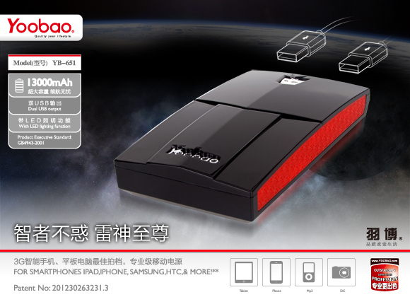 YOOBAO 13000mAh Thunder Powerbank ออกแบบสุดล้ำ วัสดุคุณภาพดี ความจุสูงสุด มาพร้อมช่อง output 2 ช่อง สามารถ ชาร์จ อุปกรณ์ 2 เครื่องในเวลาเดียวกัน เหมาะสำหรับโทรศัพท์ Smart phone ทุกรุ่น เช่น iPhone4/4s/3Gs/3G/iPod/iPad, Samsung, Blackberry, HTC, Sony, LG และอื่นๆ