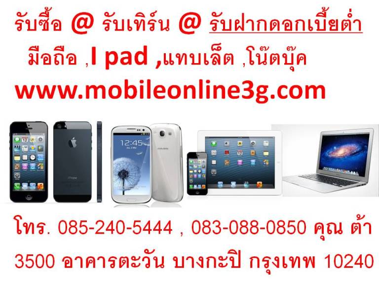 รับซื้อ-รับฝาก มือถือ,โน๊ตบุ๊ค,แท็บเล็ต ดอกเบี้ยต่ำ ร้อนเงินคุยกันได้สบายๆ ที่อาคารตะวันนาบางกะปิ กรุงเทพ
