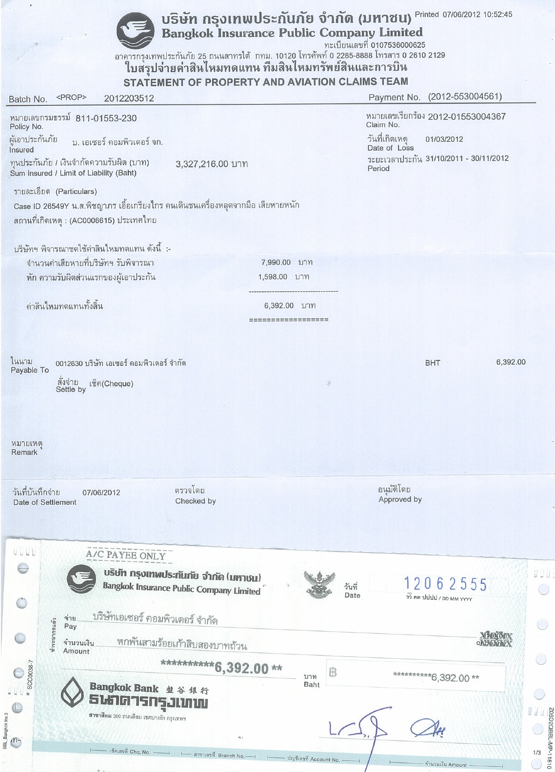 หลังจากเคลมกันเรียบร้อยก็ได้เช็คจากบ.ประกันคืนมา 80% จาก 7990 ก็ได้คือมาที่ 6300 กว่าๆ เมื่อเดือนมิถุนายน 2555 นี้เองครับ เงื่อนไขคือต้องไปซื้อสินค้าของ acer เท่านั้น อะไรก็ได้