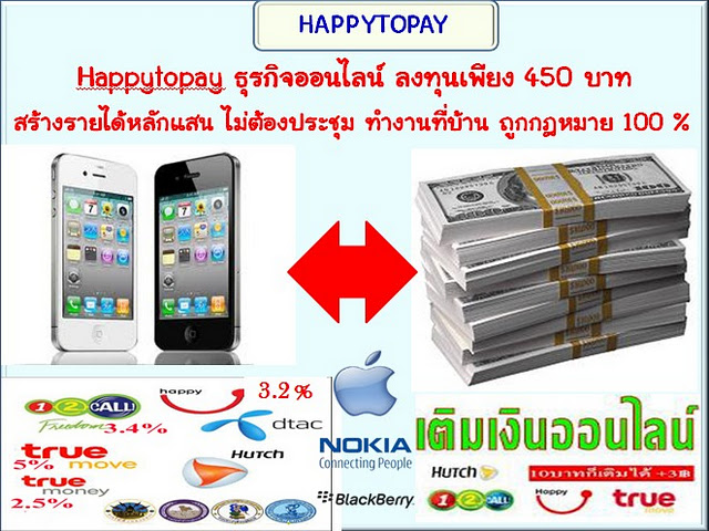 หาเงินง่ายๆ กับงานออนไลน์ Happy2Pays ใครอยากได้ 200 บาท/รหัส 44,150 บาท/เดือน โอนเข้าบัญชี เรื่อยๆ ตลอดไป ศึกษาด่วน! เป็นธุรกิจเกี่ยวกับการชำระค่าสาธารณูปโภคต่างๆ เช่น จ่ายค่าน้ำค่าไฟ เติมเงินมือถือทุกระบบ ฯลฯ เป็นเค้าเตอร์เซอร์วิสคล้ายกับเซเว่นอีเ