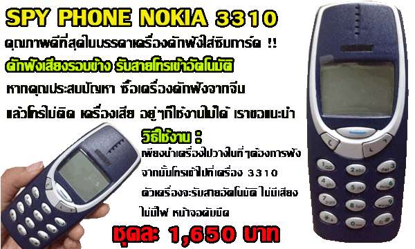 มือถือ Nokia 3310เครื่องนี้ จะเป็นมือถือ โทรเข้า- โทรออกได้ปกติ และหากต้องการใช้ฟังชั่นดักฟัง คุณจะต้อง กดคีย์ลับ ที่ Nokia 3310ก่อน เมื่อกดแล้ว ถึงหน้าจอจะมืด เหมือนปิดเครื่อง และกลายเป็นเครื่องดักฟัง