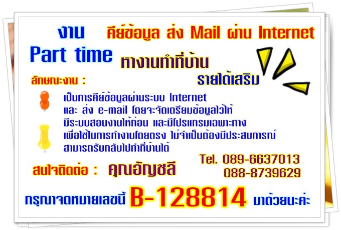 งาน Part time คีย์ข้อมูล ส่ง Mail ผ่าน Internet รายได้เสริม หางานทำที่บ้าน