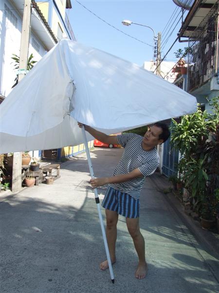 ร่ม ทรง สี่เหลี่ยม สีขาว สูงประมาณ 3 เมตร ขาตั้งไม่มี