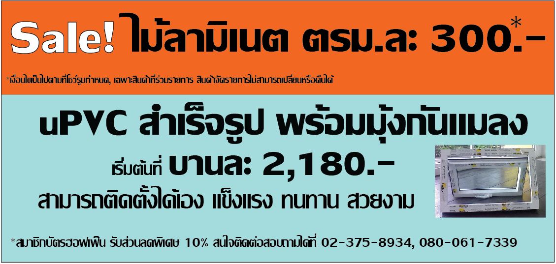 ประตู-หน้าต่างuPVC แบบสำเร็จรูปพร้อมมุ้งกันแมลง ราคาเริ่มต้นที่บานละ 2,180 บาท สนใจติดต่อสอบถามข้อมูลเพิ่มเติมได้ที่โชว์รูมฮอฟเฟ็น T 02-375-8934, 02-375-8935, T02-375-8937, 02-375-8938 Fax. 02-704-8240 เวลาทำการ วันจันทร์ –วันเสาร์ 9.00 –18.00 น. เwww.hoffenasia.com *เฉพาะสินค้าที่ร่วมรายการส่งเสริมการขายเท่านั้น / *เงื่อนไขเป็นไปตามที่โชว์รูมกำหนด