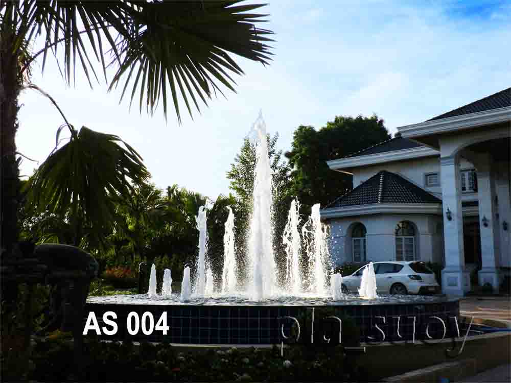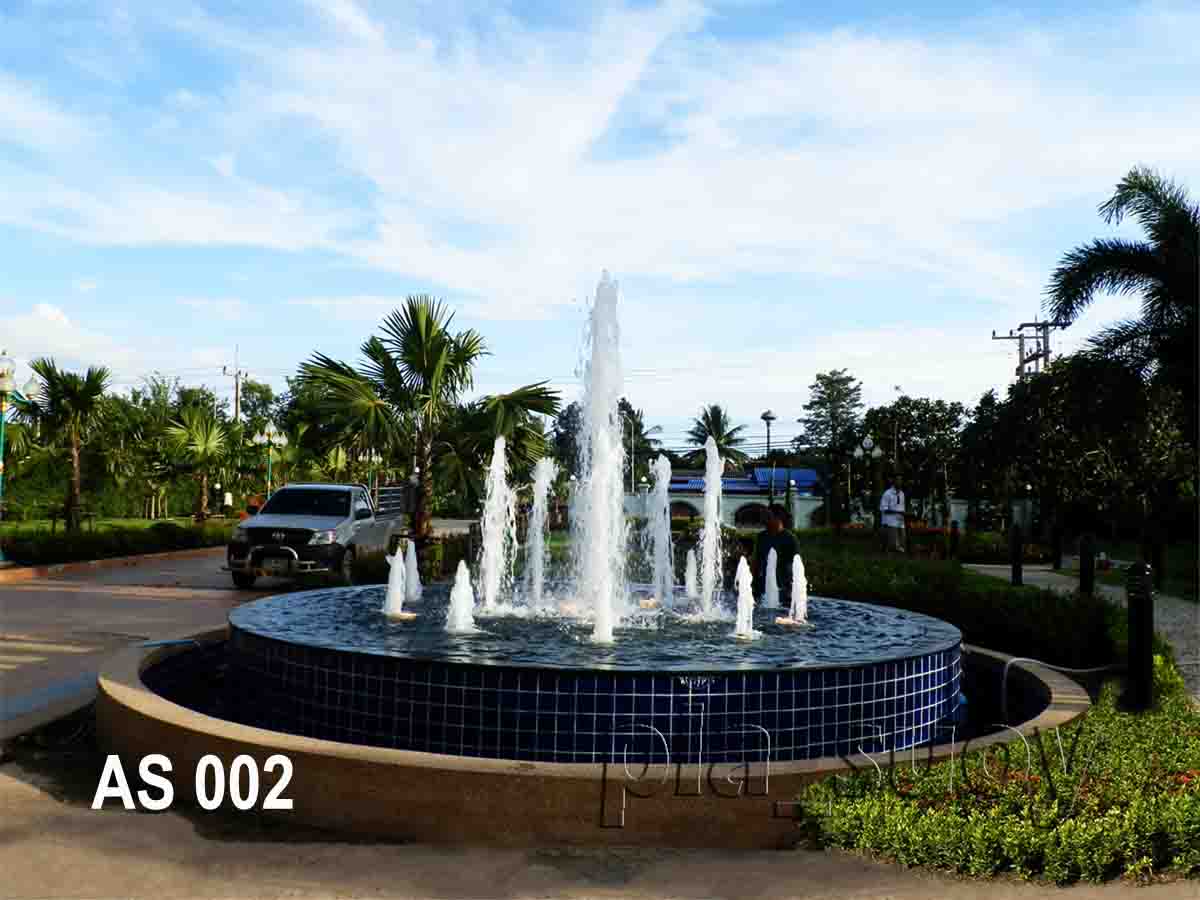 รูปทรงน้ำพุ แบ่งเป็น 3 ชั้น ชั้นในสุดมีหัวน้ำพุต้นสน ขนาด 2”อยู่ตรงกลาง ยิงสูง 2.50 ม. ชั้นที่2 เป็นวง Ring สแตนเลส ขนาด 1.80 ม. ใส่หัวน้ำพุต้นสน 1” จำนวน 5 หัวยิงสูง 1.50 ม. และชั้นที่ 3 เป็นวง Ring สแตนเลส ขนาด 3.20 ม. ใส่หัวน้ำพุต้นสน 1” จำนวน 10 หัว ยิงสูง 0.40 ม. ชุดน้ำพุในแต่ละชั้น ใช้ปั๊มชุดละตัว แยกกันอย่างอิสระ แยกชุดควบคุมและนาฬิกา
