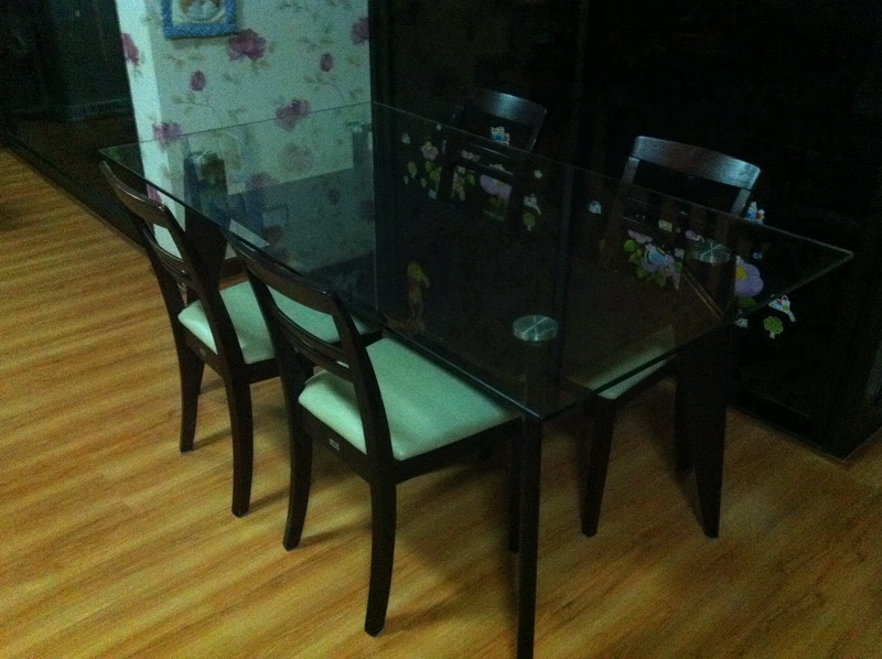 ขายโต๊ะกินข้าวมือสอง ขนาด 90 cm x 160 cm ด้านบนเป็นกระจกนิรภัยหนา 10 มล ขายพร้อมเก้าอี้ 4 ตัว ราคา 4900 บาท