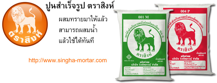 ปูนตราสิงห์ ปูนสำเร็จรูปสำหรับงานก่อสร้างยุคใหม่ เป็นปูนสำเร็จรูป(มอร์ต้า) ผสมทรายคัดพิเศษซึ่งผ่านการล้างด้วยน้ำสะอาด และอบแห้งมาให้แล้ว สามารถผสมน้ำแล้วใช้งานได้ทันที