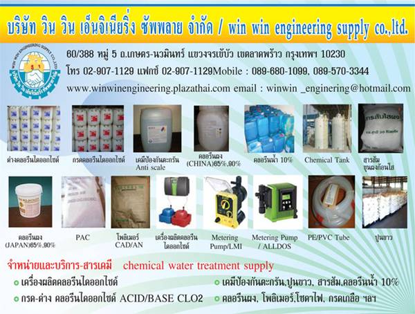 บริษัท วิน วิน เอ็นจิเนียริ่ง ซัพพลาย จำกัด จำหน่ายอุปกรณ์สระว่ายน้ำ,คลอรีนสระว่ายน้ำ ,ไฟใต้สระว่ายน้ำ , เครื่องผลิตคลอรีนสระว่ายน้ำ , ปั๊มสระว่ายน้ำ ,เครื่องกรองสระว่ายน้ำไฟสำหรับสระว่ายน้ำ เคมีภัณฑ์สระว่ายน้ำ ด่างคลอรีนไดออกไซด์, กรดคลอรีนไดออกไซด์, เคมีป้องกันตะกรัน, คลอรีนผง, คลอรีนน้ำ 10%, Chemical Tank, สารส้ม, เครื่องผลิตคลอรีนไดออกไซด์, ปูนขาว, สารกรองน้ำ, เกลือล้างเรซิน, ถังกรองน้ำสแตนเลส, ถังกรองสระว่ายน้ำ, หัวกรอง, ไส้กรองน้ำ, ปั๊มจ่ายสารเคมี, ปั๊มน้ำ, ปั๊มน้ำเสีย, เครื่องมือวัดคุณภาพน้ำ