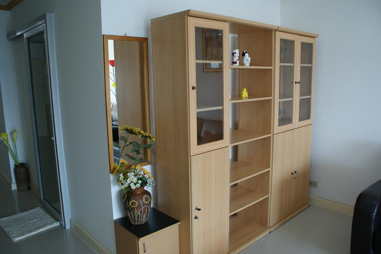 ให้เช่า ห้องพักอาคารชุดใน Modern Home Tower ชั้น 20 พท.44 ตารางเมตร พร้อม เฟอร์นิเจอร์ตกแต่ง ด้วยวัสดุดีเยี่ยม ห้อง สีขาวครีม ตู้โชว์ built in