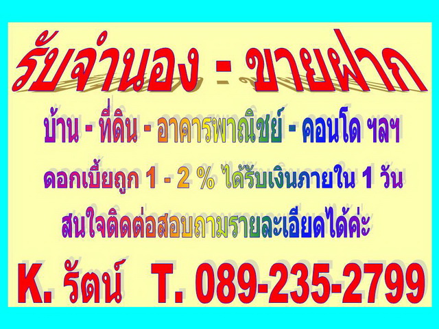 รับจำนองขายฝาก ฝากขาย บ้าน อาคารพาณิชย์และที่ดินติดต่อได้ที่นี่ค่ะ อัตราดอกเบี้ย 1-2 % ได้รับเงินภายใน 1 วัน สนใจโทรมาสอบถามได้ที่ 089-235-2799
