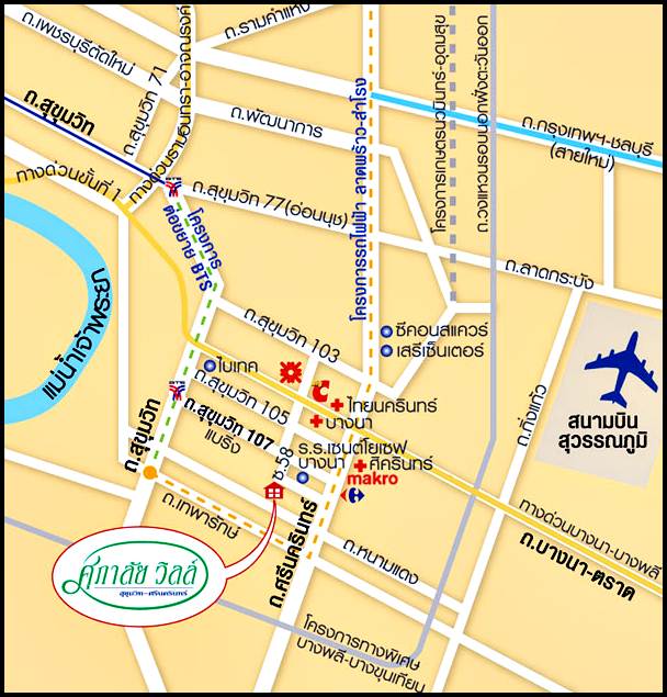 โครงการ ศุภาลัยวิลล์ สุขุมวิท-ศรีนครินทร์ เลขที่ 8/63 เลขที่โฉนด 293243 หน้าสำรวจ 2155 ซอยสุขุมวิท 107 แบริ่ง 58 ถนน สุขุมวิท-ศรีนครินทร์ ม.8 ต.สำโรงเหนือ อ.เมือง จ.สมุทรปราการ ทาวน์เฮ้าส์ 3ชั้น เนื้อที่ 20.3 ตรว. กว้าง 5.7 ม. ลึก 14.2 ม. พื้นที่ใช้สอย 149.35 ตรม. 3 ห้องนอน 3 ห้องน้ำ 1 ห้องครัว 1 รับแขก แอร์ 3 เครื่อง โครงสร้าง - คอนกรีตเสริมเหล็ก บ้านตกแต่งพร้อมอยู่ (มุ้งลวด, ผ้าม่าน, ปั๊มน้ำ+แทงค์น้ำ, เครื่องทำน้ำอุ่น อีกทั้งยังครบครันด้วยเฟอร์นิเจอร์ อาทิเช่น ชุดรับแขก, โต๊ะกินข้าว, เตียง โต๊ะเครื่องแป้ง, ตู้เสื้อผ้า และโต๊ะหนังสือทุกห้อง) -โครงการคุณภาพศุภาลัย มีระบบรักษาความปลอดภัย 24 ชม. สระว่ายน้ำ สวนสาธารณะ สนามเด็กเล่น เคเบิล ร้านค้า/อาหาร ร้านเสริมสวย บริการซักรีด -ทำเลดีมาก เข้าออกสะดวกได้หลายเส้นทาง ทั้งทางถนนสุขุมวิท 107 (ซอยแบริ่ง 58) สุขุมวิท 105 และถนนศรีนครินทร์ (ศรีด่าน 3) ใกล้จุดขึ้นลงทางด่วนบางนา -ติดรถไฟฟ้า(BTS สายสีเขียว อ่อนนุช-แบริ่ง) สถานที่ใกล้เคียง 1.ร.ร.เซ็นโยเซฟบางนา / ร.ร.ลาซาล / ร.ร.นานาชาติ / โรงพยาบาลศิครินทร์ / โรงพยาบาลไทยนครินทร์ 2.คาร์ฟู / แมคโคร / โลตัส-ศรีนครินทร์ / ซีคอน / พาราไดซ์พาร์ค / เซ็นทรัล 3.ศูนย์แสดงสินค้าไบเทคบางนา / สนามบินสุวรรณภูมิ / สวนหลวง ร.9